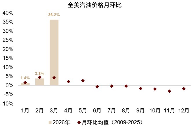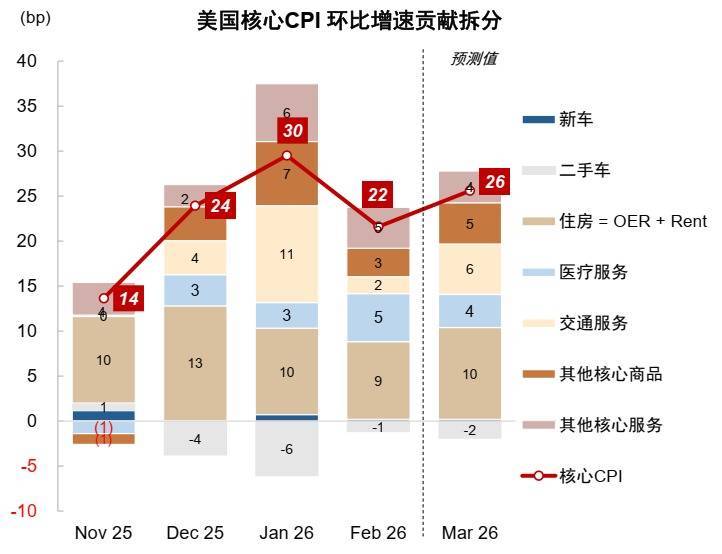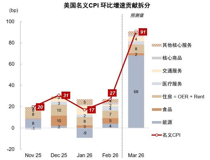 一是伊朗冲突导致3月份能源价格超季节性上涨,直接推升3月美国能源和交通服务CPI分项,并将间接传导至核心商品和食品分项。