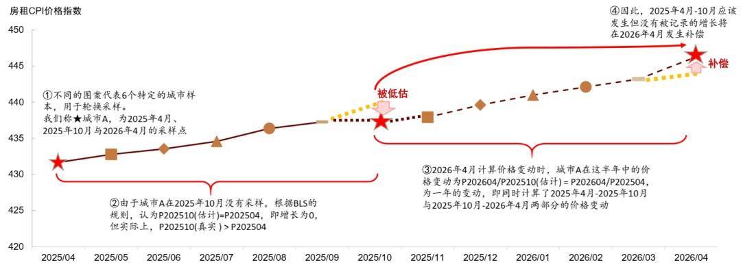 二是房租样本轮换的补偿效应。2025年10-11月美国政府停摆,导致10月份房租CPI环比涨幅被记为0。经过6个月后,房租样本再度轮换至去年10月份的样本,样本轮换的补偿效应将导致4月份房租CPI(占比约34%)环比涨幅翻倍,推升当月通胀读数。